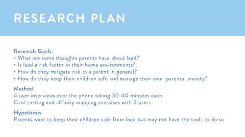 To un-cover user needs and pain points, I interviewed several parents to find out about their thoughts on lead, and how they reduce hazards in general. I was surprised to learn that two of the parents I interviewed had children test positive for lead exposure.